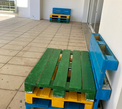 No âmbito do Programa Eco- Escolas, a turma TAF 2020-2023 construiu bancos em paletes, para dar cor e alegria à esplanada da Escola, podendo todos usufruir da melhor forma deste espaço.